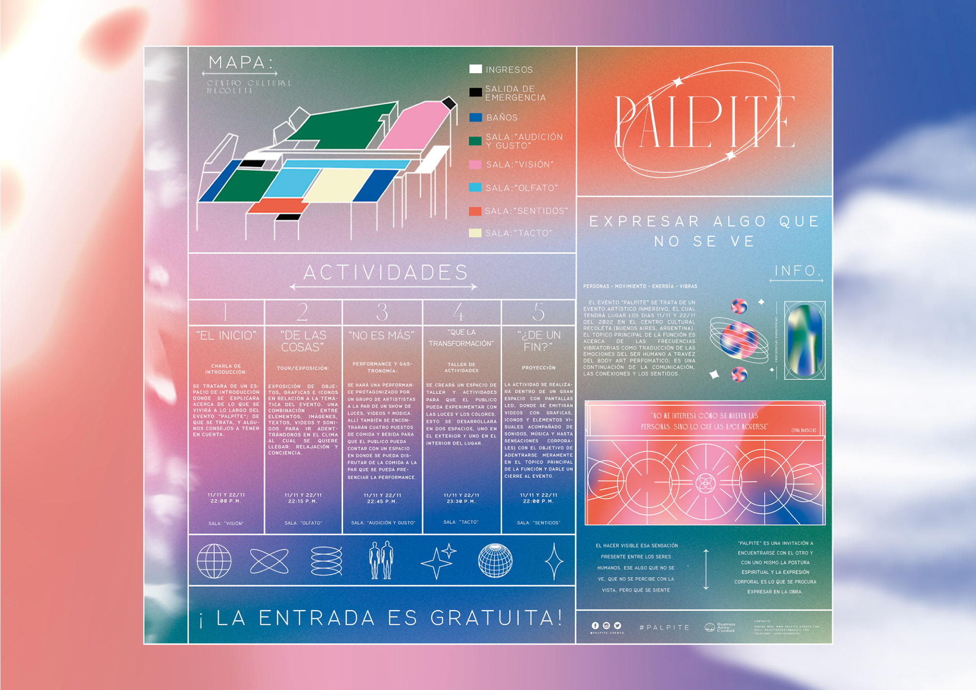 Diseño del festival "Palpite" enfocado en el tópico de las frecuencias vibratorias como traducción de las emociones del ser humano a travez de la performance. Proyecto Final de Curso: "Festival" - Pablo Lódolo Moyano - LAB II - Lic. en Diseño - Universidad Torcuato Di Tella - 2021 - Nota final: A (10)