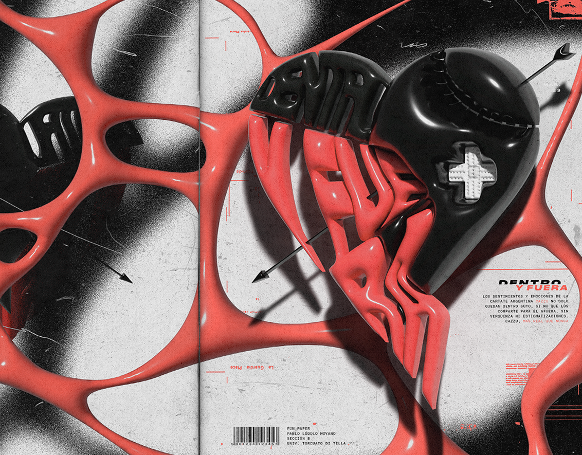 Proyecto de diseño editorial inspirado en la percepción del amor de la artista argentina Cazzu. El objetivo del proyecto es construir una narrativa visual que acompañe y expanda la narración textual, generando un clima emocional propio. A través de decisiones gráficas, tipográficas y compositivas, la pieza traduce distintas capas del amor —intensidad, contradicción y vulnerabilidad— en una experiencia editorial que dialoga con el universo simbólico de la artista.